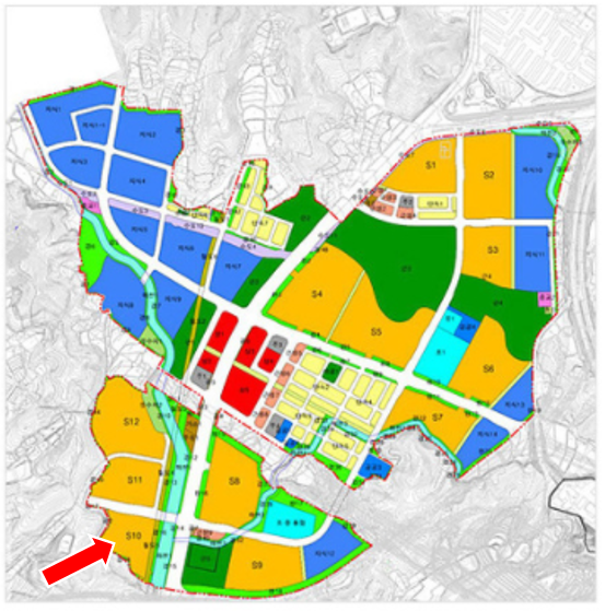 - 과천은 주거지역이 재건축이 진행 중인 주공아파트 단지들과 남쪽의 신규택지개발 지역으로 크게 둘로 나눠져 있습니다. 남쪽 택지개발 지역이 바로 과천 지식정보타운이며, 이번 통합공공임대주택은 S-10블록(그림 속 화살표)에 들어서게 됩니다.