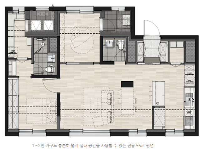 39ㆍ55ㆍ59ㆍ74ㆍ84㎡ 등 5개 평면에는 하나의 공간을 입주자의 취향에 맞춰 바꿀 수 있는 레이어드 홈(Layered Home) 기능을 더해진다고 합니다.